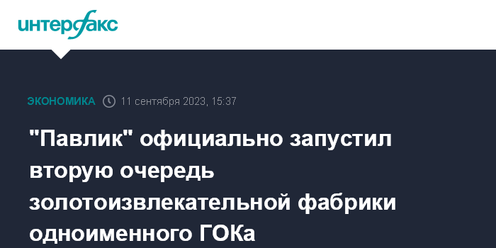Москва. 11 сентября. INTERFAX.RU - Компания "Павлик" официально запустила вторую очередь золотоизвлекательной фабрики одноименного ГОКа.