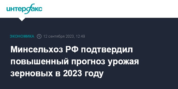 Москва. 12 сентября. INTERFAX.RU - Минсельхоз РФ подтвердил повышение прогноза по урожаю зерновых в 2023 году до 130 млн тонн.