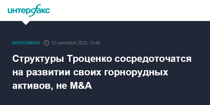Москва. 12 сентября. INTERFAX.RU - Структуры Романа Троценко планируют концентрироваться, прежде всего, на развитии своих горнорудных активов, не приобретая новых, заявил бизнесмен журналистам в кулуарах ВЭФ-2023.