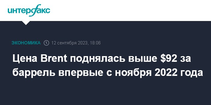 Цена Brent поднялась выше $92 за баррель впервые с ноября 2022 года