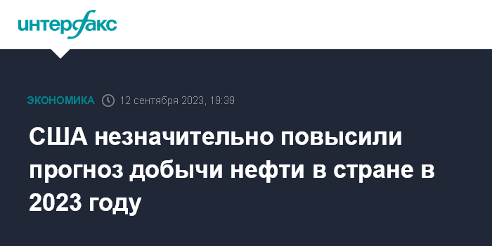 Москва. 12 сентября. INTERFAX.RU - Минэнерго США повысило прогноз добычи нефти в стране (без учета других жидких углеводородов) на 2023 год с 12,76 млн б/с до 12,78 млн б/с, говорится в ежемесячном прогнозе управления энергетической информации (EIA) ведомства.