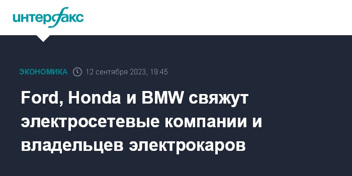 Москва. 12 сентября. INTERFAX.RU -Ford Motor, американское подразделение японской Honda Motor и германская Bayerische Motoren Werke AG создают компанию в сфере электросетевых услуг, связанных с электромобилями, сообщил Ford.