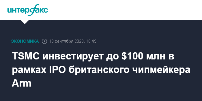 Москва. 13 сентября. INTERFAX.RU - Тайваньский производитель микросхем на заказ Taiwan Semiconductor Manufacturing Company планирует инвестировать до $100 млн в рамках IPO британского чипмейкера Arm Holdings. Это решение утвердил совет директоров TSMC, говорится в сообщении компании.