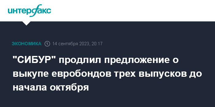 Москва. 14 сентября. INTERFAX.RU - "СИБУР" продлил действие предложения о выкупе долларовых еврооблигаций трех выпусков до начала октября, сообщила компания-эмитент Sibur Securities DAC.