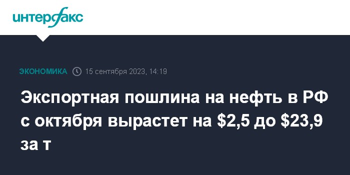 Москва. 15 сентября. INTERFAX.RU - Экспортная пошлина на нефть в РФ с 1 октября 2023 года вырастет на $2,5 – с $21,4 до $23,9 за тонну, отмечается в расчетах, опубликованных Минфином.