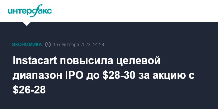 Москва. 15 сентября. INTERFAX.RU - Оператор американского сервиса доставки продуктов Instacart повысил целевой диапазон первичного размещения акций.