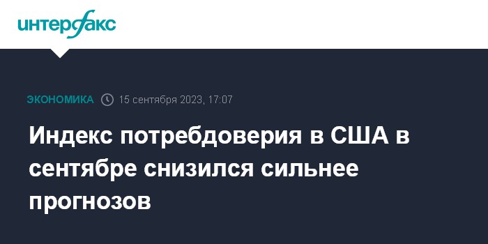 Москва. 15 сентября. INTERFAX.RU - В сентябре 2023 года индекс потребительского доверия в США снизился до 67,7 пункта с 69,5 пункта месяцем ранее, говорится в предварительном отчете Мичиганского университета, который рассчитывает этот показатель.