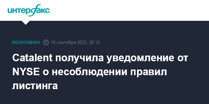 Москва. 15 сентября. INTERFAX.RU - Американская фармацевтическая Catalent Inc. получила уведомление от Нью-Йоркской фондовой биржи (NYSE) о несоблюдении правил листинга из-за задержки в подаче годовой отчетности в Комиссию по ценным бумагам и биржам (SEC).