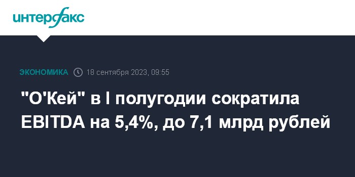 Москва. 18 сентября. INTERFAX.RU - Группа компаний "О'Кей" по итогам I полугодия 2023 года сократила EBITDA по МСФО на 5,4% - до 7,1 млрд рублей, говорится в сообщении ритейлера.