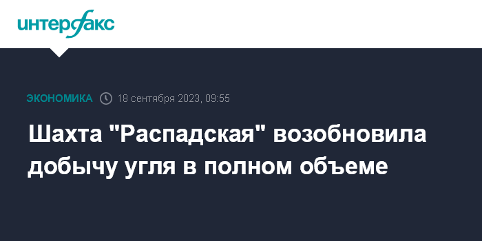 Москва. 18 сентября. INTERFAX.RU - Шахта "Распадская" (входит в ПАО "Распадская", в котором 93,2% принадлежит Evraz), где суд ранее на 90 суток частично приостановил угледобычу, возобновила ее в полном объеме.
