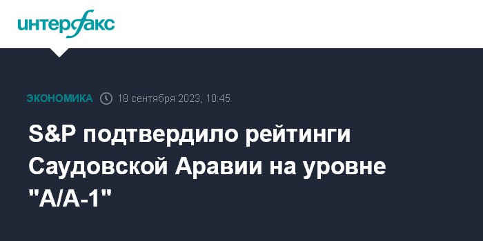 Москва. 18 сентября. INTERFAX.RU - Международное рейтинговое агентство S&P Global Ratings подтвердило суверенные кредитные рейтинги Саудовской Аравии в иностранной и национальной валютах "А/А-1". Прогноз по рейтингам - "стабильный".