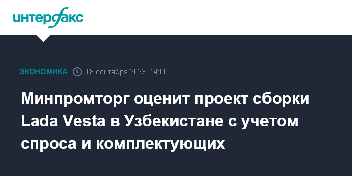 Москва. 18 сентября. INTERFAX.RU - Минпромторг РФ проанализирует перспективы сборки автомобилей Lada Vesta компании "АвтоВАЗ" в Узбекистане с учетом степени удовлетворенности спроса на машины этой марки на внутреннем рынке, а также возможностей по выпуску комплектующих.