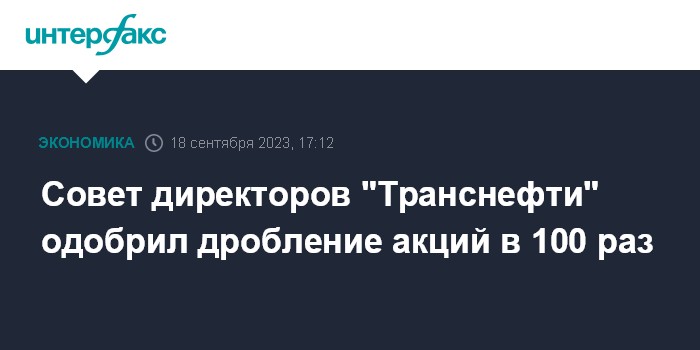 Москва. 18 сентября. INTERFAX.RU - Совет директоров "Транснефти" одобрил проведение дробления акций компании в 100 раз, сообщил эмитент.