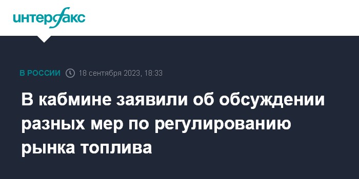 Москва. 18 сентября. INTERFAX.RU - Правительство РФ обсуждает различные меры по урегулированию ситуации на рынке топлива, сообщил замминистра финансов РФ Алексей Сазанов, отвечая на вопрос о том, обсуждается ли введение заградительной пошлины на экспорт нефтепродуктов.