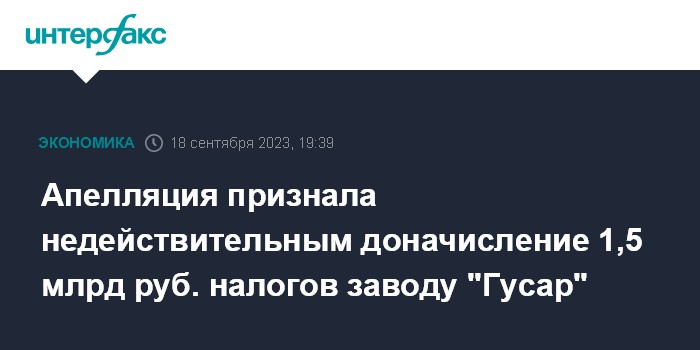 Апелляция признала недействительным доначисление 1,5 млрд руб. налогов заводу "Гусар"