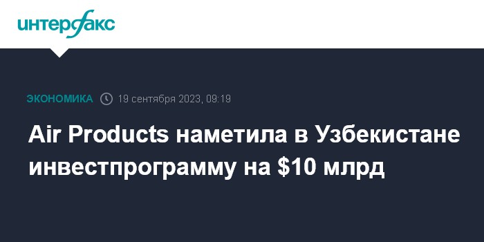 Москва. 19 сентября. INTERFAX.RU - Власти Узбекистана и американский производитель технических газов Air Products достигли соглашения о реализации инвестпрограммы на сумму свыше $10 млрд, сообщила пресс-служба президента Узбекистана Шавката Мирзиёева.