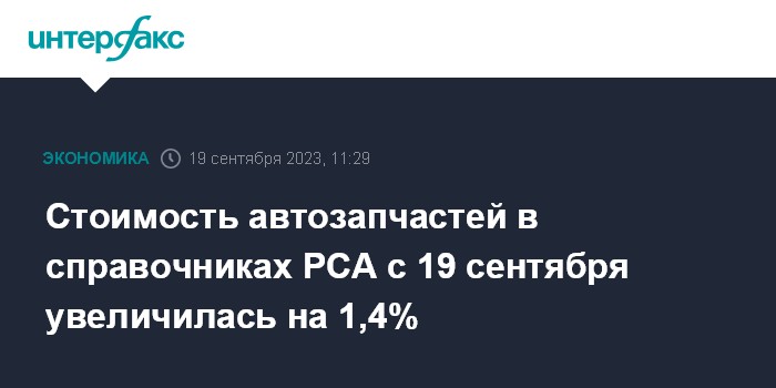 Москва. 19 сентября. INTERFAX.RU - Средняя стоимость запчастей в очередной актуализированной версии справочников восстановительного ремонта Российского союза автостраховщиков (РСА), вступающей в силу с 19 сентября 2023 года, увеличивается на 1,4%, сообщает союз со ссылкой на президента РСА Евгения Уфимцева.