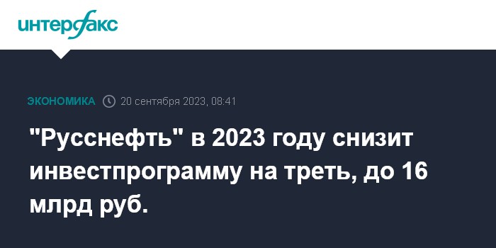 Москва. 20 сентября. INTERFAX.RU - Инвестиционная программа "Русснефти" в 2023 году была сокращена на треть, до 16 млрд рублей, сообщил журналистам президент компании Евгений Толочек в кулуарах Промышленно-энергетического форума в Тюмени.