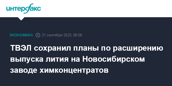 Москва. 21 сентября. INTERFAX.RU - Планы по расширению литиевого производства на ПАО "Новосибирский завод химконцентратов" (НЗХК, входит в ТК "ТВЭЛ") остаются актуальными, несмотря на изменение конъюнктуры, сообщил журналистам директор бизнес-направления "Специальная химия" АО "ТВЭЛ" Михаил Метелкин.