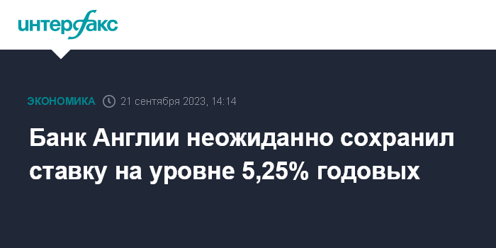 Москва. 21 сентября. INTERFAX.RU - Банк Англии по итогам сентябрьского заседания принял решение сохранить базовую процентную ставку на уровне 5,25% годовых. Экономисты и участники рынка ждали повышения ставки на 25 базисных пунктов, до 5,5%.