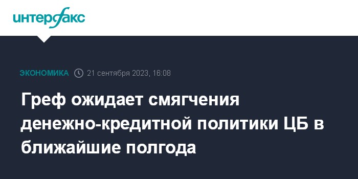 Москва. 21 сентября. INTERFAX.RU - Банк России может перейти к смягчению денежно-кредитной политики (ДКП) в ближайшие полгода, считает президент - председатель правления Сбербанка Герман Греф.