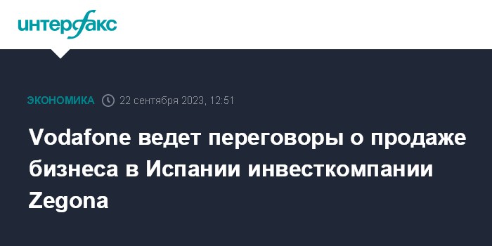 Москва. 22 сентября. INTERFAX.RU - Британский оператор мобильной связи Vodafone Group ведет переговоры о продаже своего испанского бизнеса инвесткомпании Zegona Communications, специализирующейся на телекоммуникационном секторе.