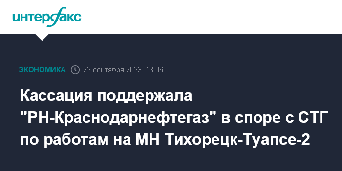 Москва. 22 сентября. INTERFAX.RU - АО "Стройтрансгаз" (СТГ) в кассации не смог оспорить решение апелляционного суда, отменившего взыскание в пользу СТГ 12,3 млн рублей задолженности с ООО "РН-Краснодарнефтегаз" (дочерняя компания НК "Роснефть") по договору подрядных работ на магистральном нефтепроводе "Тихорецк-Туапсе-2".