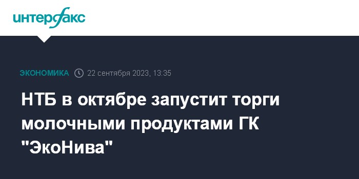 Москва. 22 сентября. INTERFAX.RU - Национальная товарная биржа (НТБ, входит в группу "Московской биржи") завершает подготовку к торгам молочными продуктами ГК "ЭкоНива", сообщила пресс-служба торговой площадки.