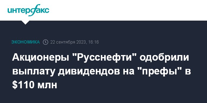 Москва. 22 сентября. INTERFAX.RU - Акционеры ПАО "Русснефть" на внеочередном собрании, прошедшем 21 сентября в заочной форме, утвердили выплату дивидендов на привилегированные акции за 2022 год в размере $1,122 на акцию, говорится в сообщении компании.