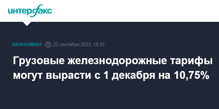 Москва. 22 сентября. INTERFAX.RU - Тарифы на железнодорожные перевозки грузов с 1 декабря 2023 года могут быть проиндексированы на 10,75% (с учетом дополнительных целевых надбавок в 1% на обеспечение транспортной безопасности и 2% на капитальный ремонт инфраструктуры), говорится в прогнозе Минэкономразвития.