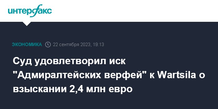 Москва. 22 сентября. INTERFAX.RU - Арбитражный суд Санкт-Петербурга и Ленинградской области удовлетворил иск АО "Адмиралтейские верфи" к финскому производителю судового энергетического оборудования Wartsila на 2,377 млн евро, сообщается в картотеке арбитражных дел.