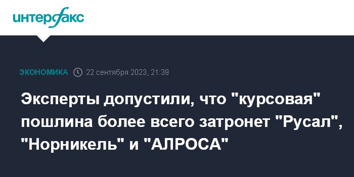 Москва. 22 сентября. INTERFAX.RU - Введение "курсовой ренты" – пошлины, зависящей от курса доллара – окажет наибольший эффект на "Русал", "Норникель" и "АЛРОСА", доля экспорта в выручке которых доминирует. При этом пошлина может косвенно задеть производителей золота, несмотря на то, что они реализуют металл на внутренний рынок, считают эксперты.