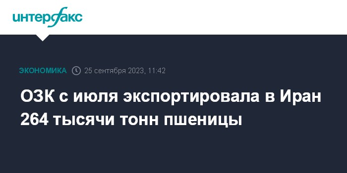 ОЗК с июля экспортировала в Иран 264 тысячи тонн пшеницы