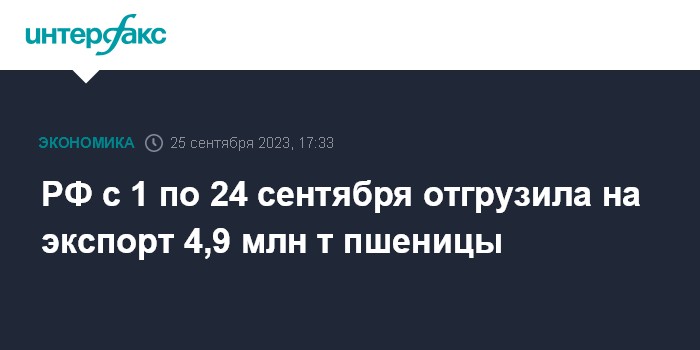 РФ с 1 по 24 сентября отгрузила на экспорт 4,9 млн т пшеницы