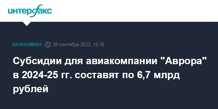 Москва. 26 сентября. INTERFAX.RU - Субсидии на авиаперевозки по социально значимым маршрутам Дальневосточного федерального округа, получателем которых является авиакомпания "Аврора", в 2024-2025 гг. составят по 6,7 млрд руб., в 2026 - более 7 млрд руб. Об этом говорится в проекте федерального бюджета на 2024 г. и плановый период 2025-2026 гг., с которым ознакомился "Интерфакс".