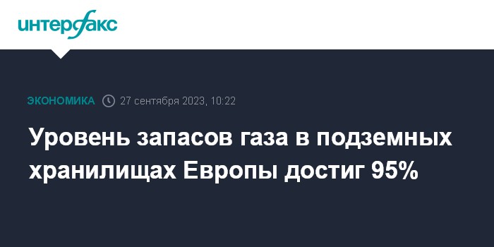 Москва. 27 сентября. INTERFAX.RU - Средний уровень наполненности подземных хранилищ Европы превысил 95%. Это уровень высокий, но отнюдь не рекордный: за историю наблюдений ассоциации Gas Infrastructure Europe выше уровень запасов был в 2011 и 2019 году, чуть пониже, чем сейчас - в 2020.
