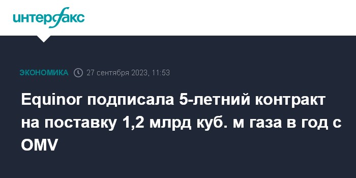 Москва. 27 сентября. INTERFAX.RU - Норвежская Equinor подписала пятилетний контракт на поставку 12 Твч (1,2 млрд куб. м - ИФ) в год с австрийской OMV, сообщила норвежская компания.
