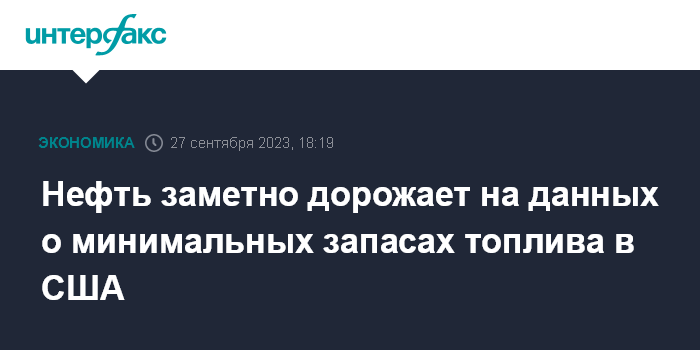 Москва. 27 сентября. INTERFAX.RU - Цены на нефть эталонных марок ускорили рост вечером в среду после выхода данных о запасах топлива в США.