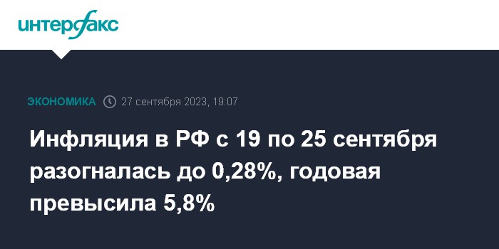 Москва. 27 сентября. INTERFAX.RU - Инфляция в РФ с 19 по 25 сентября резко ускорилась до 0,28% после 0,13% с 12 по 18 сентября, также 0,13% с 5 по 11 сентября и 0,11% с 29 августа по 4 сентября, соответствующие данные приводятся в сообщении Росстата.