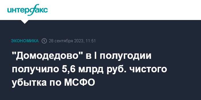 Москва. 28 сентября. INTERFAX.RU - Группа компаний DME Ltd, управляющая аэропортом "Домодедово", в I полугодии 2023 года получила 5,6 млрд руб. чистого убытка по МСФО против чистой прибыли в 13,7 млрд руб. за тот же период прошлого года, сказано в опубликованной отчетности.