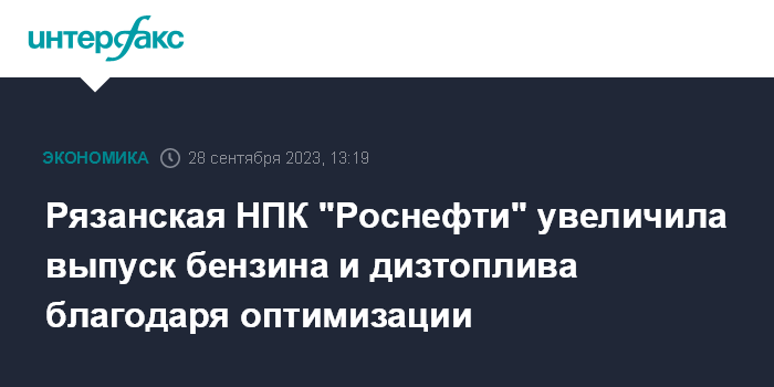 Москва. 28 сентября. INTERFAX.RU - "Рязанская нефтеперерабатывающая компания" (входит в НК "Роснефть") в первом полугодии 2023 года увеличила выпуск дизельного топлива и автомобильных бензинов благодаря оптимизации производства, сообщила нефтяная компания.