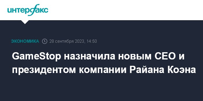 Москва. 28 сентября. INTERFAX.RU - Американская GameStop Corp., владелец сети магазинов видеоигр и игровой электроники, назначила на должность главы и президента компании инвестора Райана Коэна, сообщает MarketWatch.