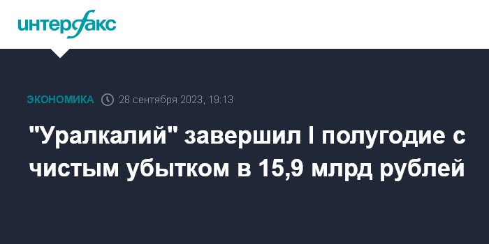 Москва. 28 сентября. INTERFAX.RU - ПАО "Уралкалий" получил по итогам первого полугодия 2023 года чистый убыток в размере 15,908 млрд рублей по сравнению с чистой прибылью в 131,819 млрд рублей в первом полугодии 2022 года, говорится в промежуточном консолидированном отчете компании.