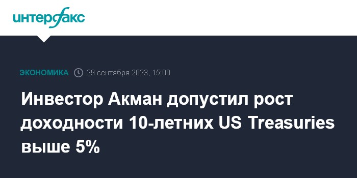Москва. 29 сентября. INTERFAX.RU - Доходность 10-летних гособлигаций США может превысить 5% годовых в ближайшие недели, прогнозирует известный американский инвестор-миллиардер Билл Акман. Об этом пишет MarketWatch.