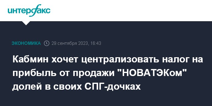 Москва. 29 сентября. INTERFAX.RU - Правительство РФ внесло в Госдуму законопроект, предполагающий перечисление в полном объеме в федеральный бюджет налога на прибыль от операций по продаже "НОВАТЭКом" долей в своих дочерних компаниях, владеющих правом на экспорт сжиженного природного газа (СПГ).