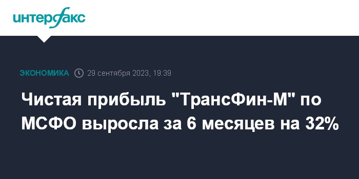 Москва. 29 сентября. INTERFAX.RU - Чистая прибыль лизинговой компании ПАО "ТрансФин-М" по МСФО выросла в январе-июне 2023 года на 32%, до 10,6 млрд рублей с 8,1 млрд рублей годом ранее, говорится в отчете эмитента.