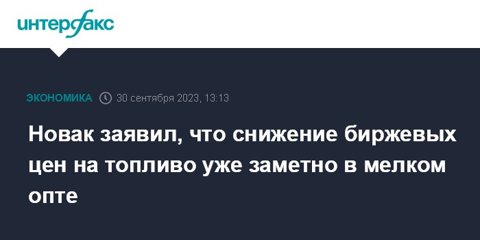 Москва. 30 сентября. INTERFAX.RU - Снижение биржевых цен на нефтепродукты уже транслируется в мелкий опт и для аграриев, заявил вице-премьер РФ Александр Новак в интервью автору программы "Москва. Кремль. Путин" телеканала "Россия 1" (ВГТРК) Павлу Зарубину. Фрагмент интервью выложен в телеграм-канале журналиста.