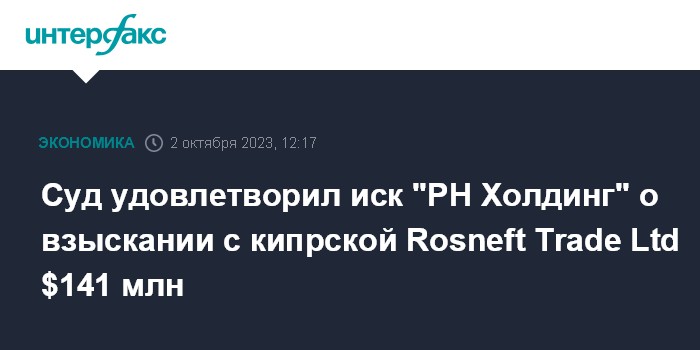 Москва. 2 октября. INTERFAX.RU - Арбитражный суд Москвы удовлетворил иск АО "РН Холдинг" (структура "Роснефти", ранее "ТНК-ВР Холдинг) к зарегистрированной на Кипре Rosneft Trade Limited (предыдущее наименование TNK Trade Limited) о взыскании около $141,1 млн, передает корреспондент "Интерфакса" из зала суда.
