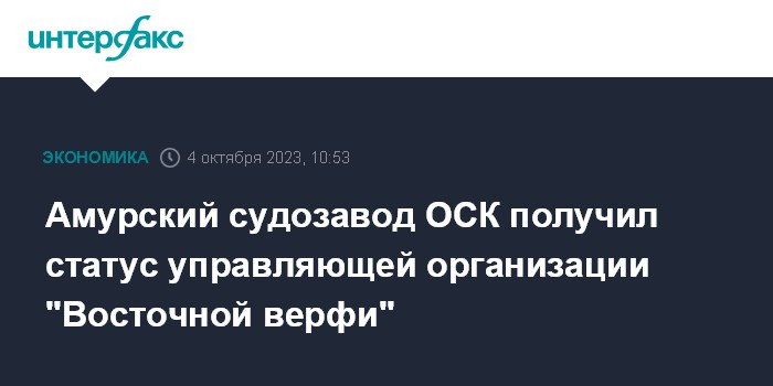 Москва. 4 октября. INTERFAX.RU - ПАО "Амурский судостроительный завод" (АСЗ, входит в ОСК) получило статус управляющей организации, которая будет осуществлять полномочия единоличного исполнительного органа АО "Восточная верфь" (Владивосток), говорится в сообщении АСЗ.