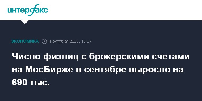 Москва. 4 октября. INTERFAX.RU - Количество физлиц, имеющих брокерские счета на Московской бирже, в сентябре 2023 года увеличилось на 690 тысяч, до 27,5 млн человек, сообщается в пресс-релизе биржи.